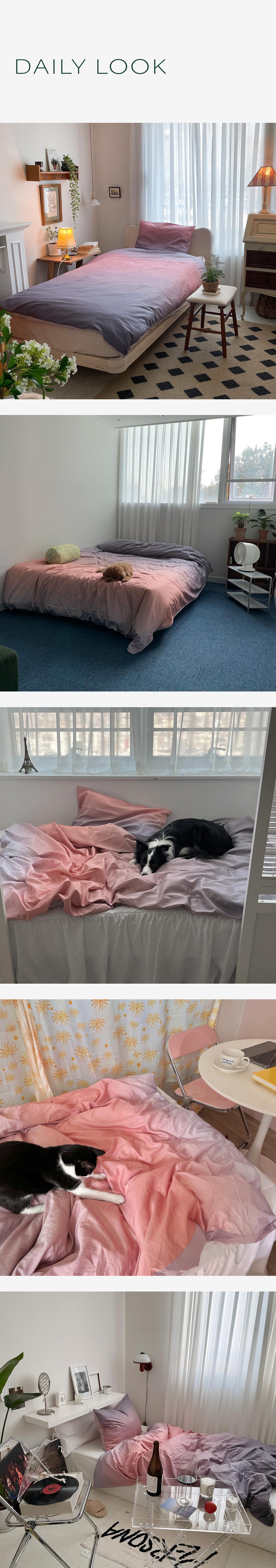 오후 5시의 해가 지는 순간을 그라데이션으로 표현한 침구입니다. 하늘색 바탕에 하얀 구름이 띈 하늘은 서서히 저물고 연한 핑크빛이 물들으면서 시간이 흐를수록 붉어지는 짙은 보랏빛의 하늘을 담았습니다.