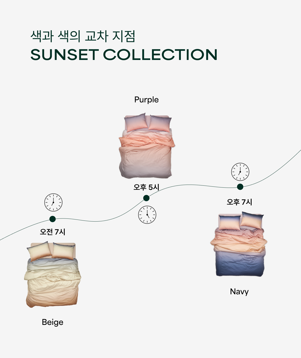 오후 7시의 해가 지는 순간을 그라데이션으로 표현한 침구입니다. 초저녁 시간의 다채로운 보라색이 시간이 흐를수록 짙어지면서 깊은 저녁을 알리는 네이비 빛의 하늘을 담았습니다.