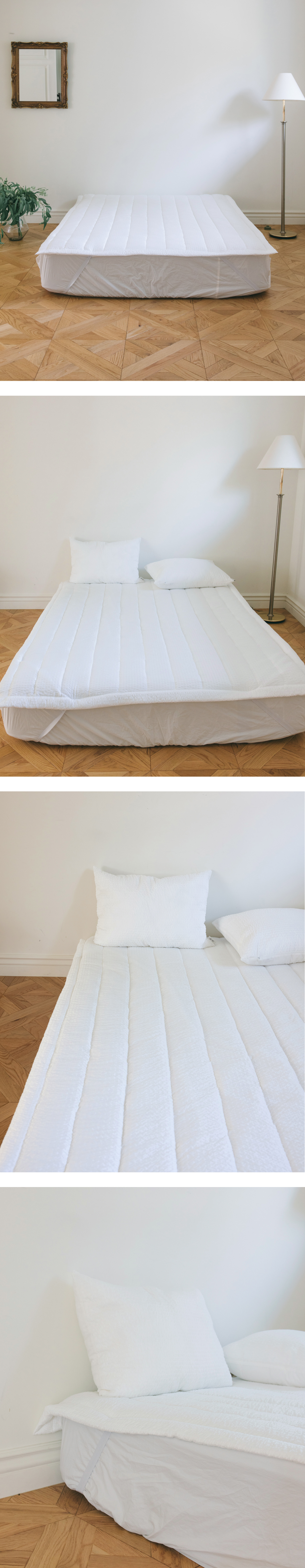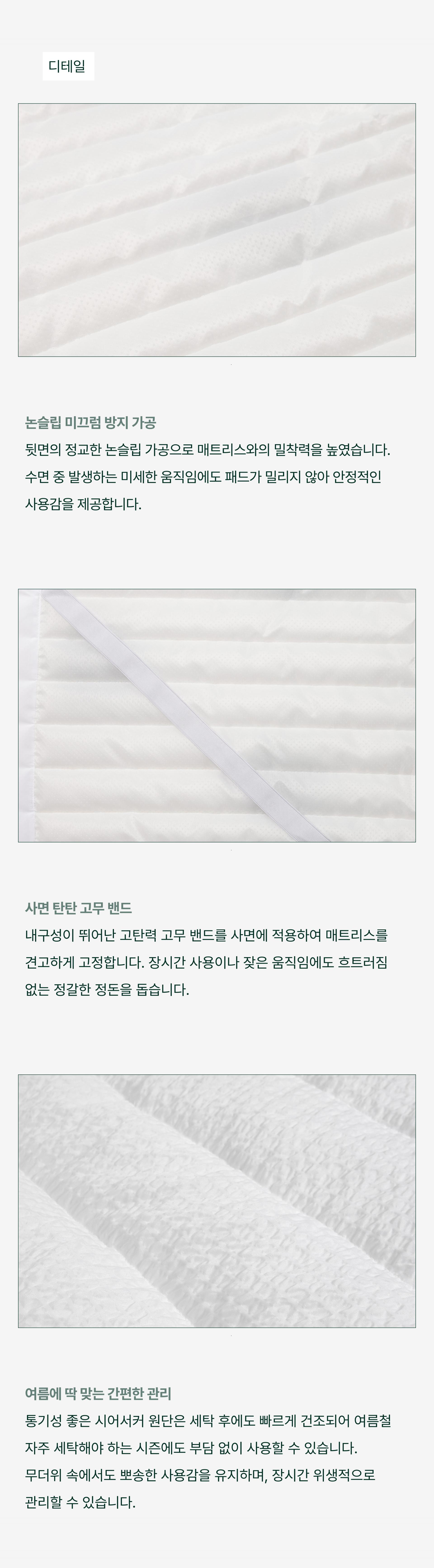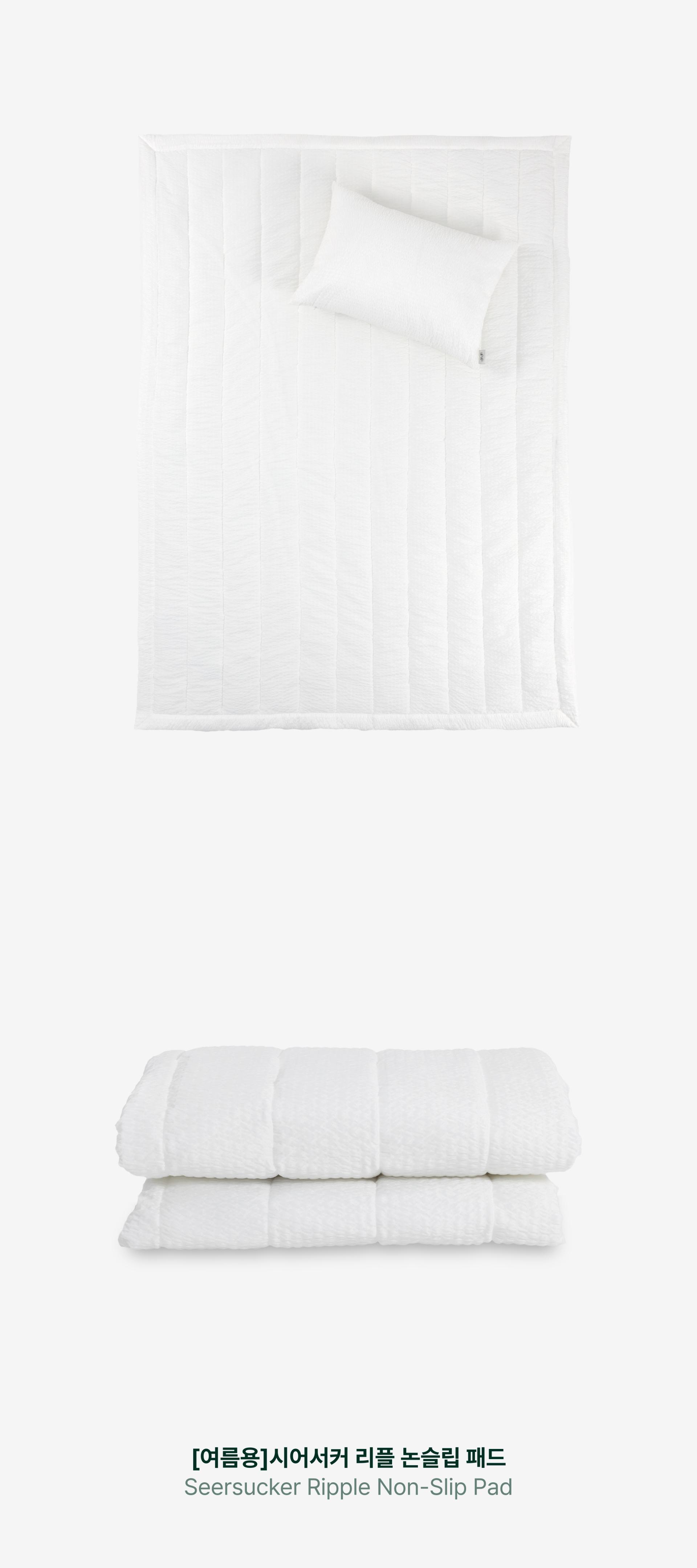 시어서커 리플 패드는 통기성과 흡습성이 우수한 시어서커 원단을 사용하여 더운 여름철에도 피부에 달라붙지 않고, 쾌적한 수면 환경을 유지합니다.