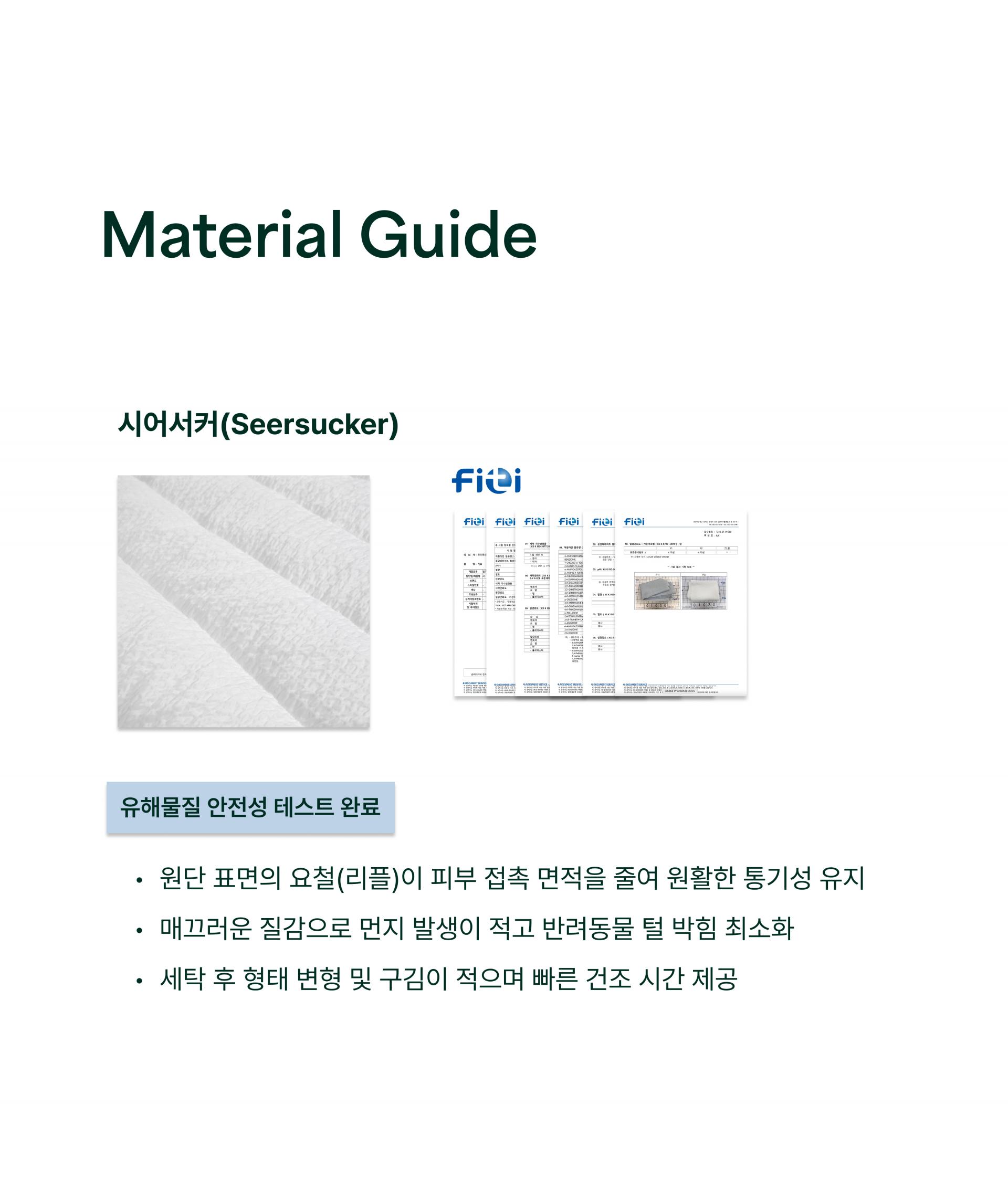 시어서커 원단은 자연스러운 엠보감이 있는 표면 구조로 인해 피부와의 접촉면을 최소화하고, 공기 흐름을 원활하게 만들어 수면 중 발생하는 땀과 열기를 빠르게 배출합니다.