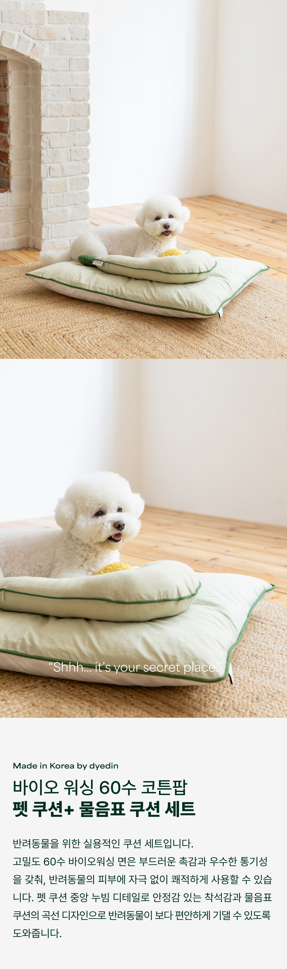 펫 쿠션과 바디 필로우를 함께 사용해 반려동물이 보다 안정감 있게 쉴 수 있도록 도와줍니다. 각 제품은 독립적으로도 사용 가능합니다.