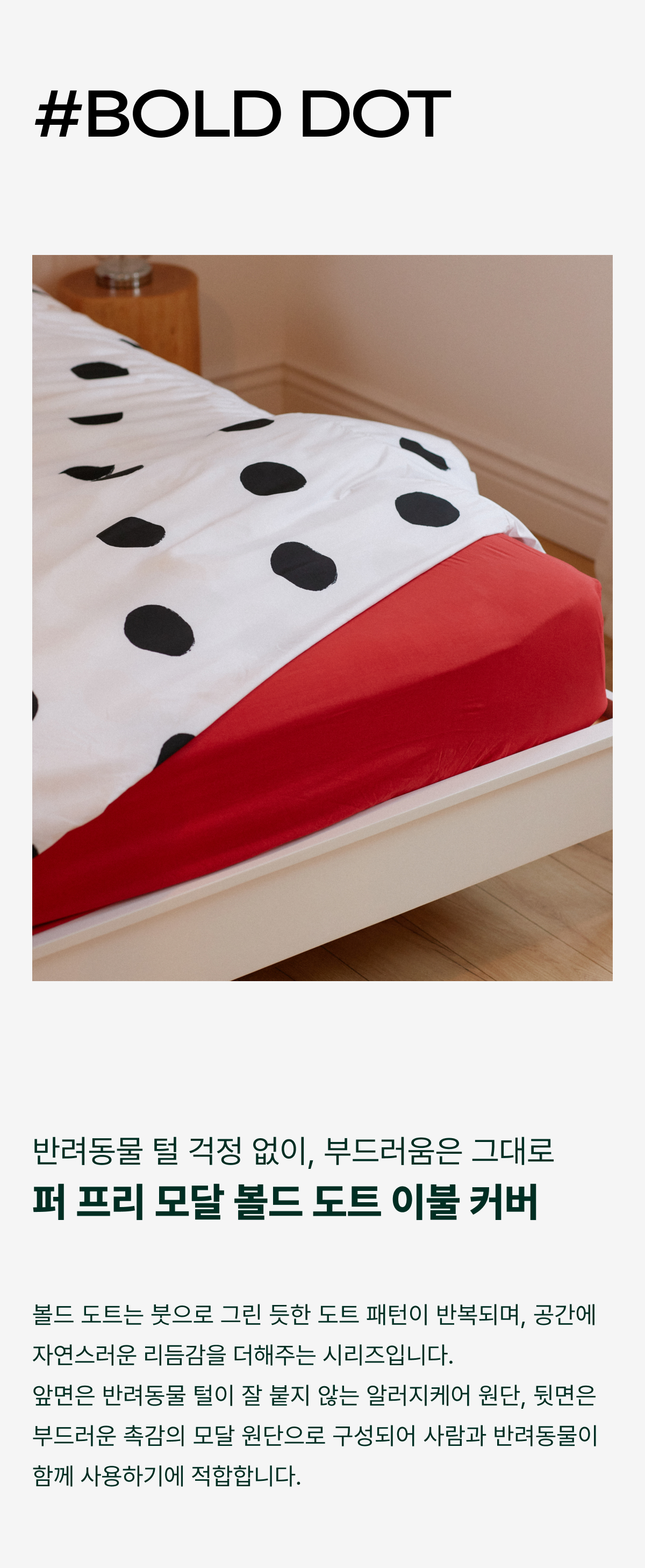 볼드 도트 이불은 도톰하게 찍어낸 듯한 입체감 있는 패턴이 공간에 포인트를 더합니다. 컬러와 텍스처를 자유롭게 레이어링해 나만의 감각적인 무드를 완성해보세요.